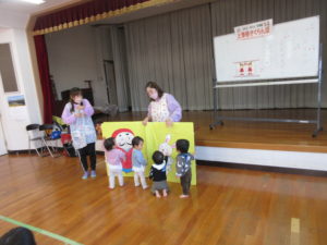 自己紹介の後は、大型絵本や「ころころたまご」「にくまんあんまん」の手遊びなど盛りだくさんでした。