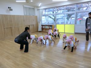 2018年12月11日 / 最終更新日 : 2018年12月12日 編集担当済美 1_行事 体育教室 今日は、月に一度の体育教室。マットに乗った友達をみんなで引っ張ったり、おしくらまんじゅうをして遊んだりしながら、体をたくさん動かしました。