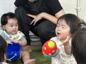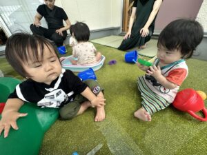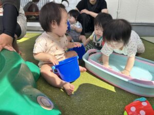 水遊びでは、初めて水あそびをするお友だちもいましたが、興味津々に触ってみたり、水遊び用の玩具で遊んだりと楽しんでいるようでした☺