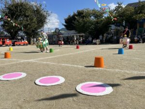 うめ組さんはフラフープ、もも組さんはサーキット、さくら組さんは鉄棒と竹馬を保護者の皆様の前で緊張しながらも上手に披露することができました。