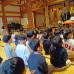 もも組・さくら組のお友だちはお寺にお参りに行って、住職さんより「天上天下唯我独尊」どの命も大切な命というお話を分かりやすく教えていただきました。